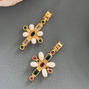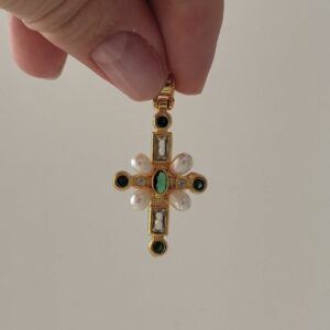 Хрестик зі смарагдом та цирконами. Срібло з позолотою. Розмір 32х20 мм. Вставка перлів.